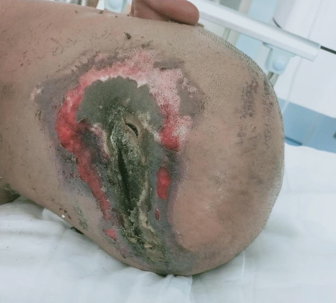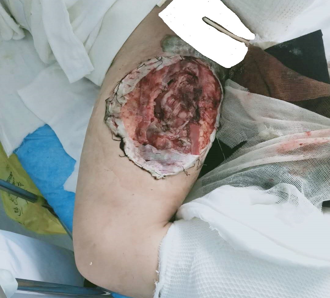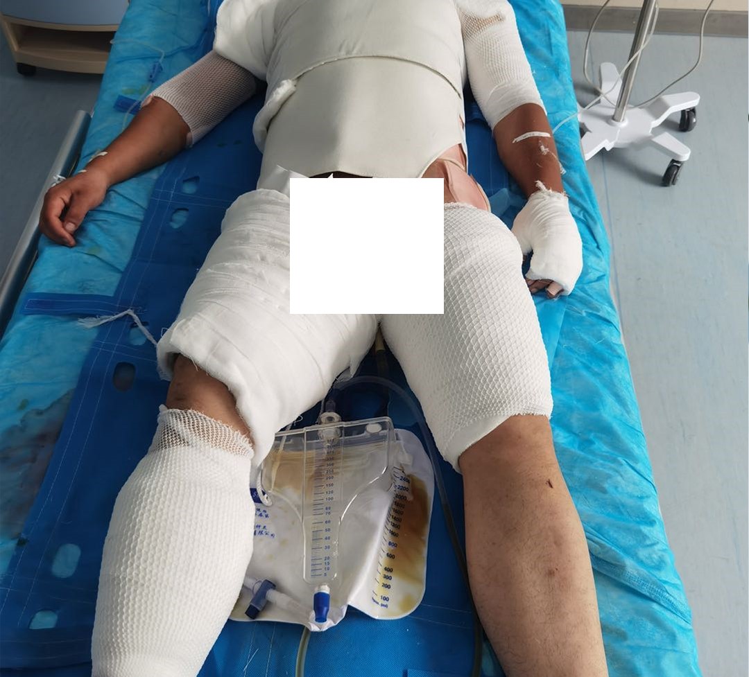 患者于伤后7小时由当地120送至秀人网 。入院后查体:嗜睡,神志模糊,懒言,精神紧张,面色、皮肤苍白,口唇甲床轻度发绀,四肢厥冷。尿液呈深茶色,尿量减少。检查心率偏快,血压偏低。急诊化验:血象高,血液浓缩状态;肝功、肾功、心功异常,血钾2.8mmol/l。电击伤出入口分布于头部、躯干、四肢等处。伤区肿胀。头枕部皮肤碳化干燥开裂,中央萎缩下陷,颅骨裸露,创缘渗血。右大腿内侧皮肤软组织碳化崩解,局部软组织及肌肉缺失,脂肪外翻,股骨干裸露,创周肿胀明显,张力高,基底可见裸露血管搏动性出血。