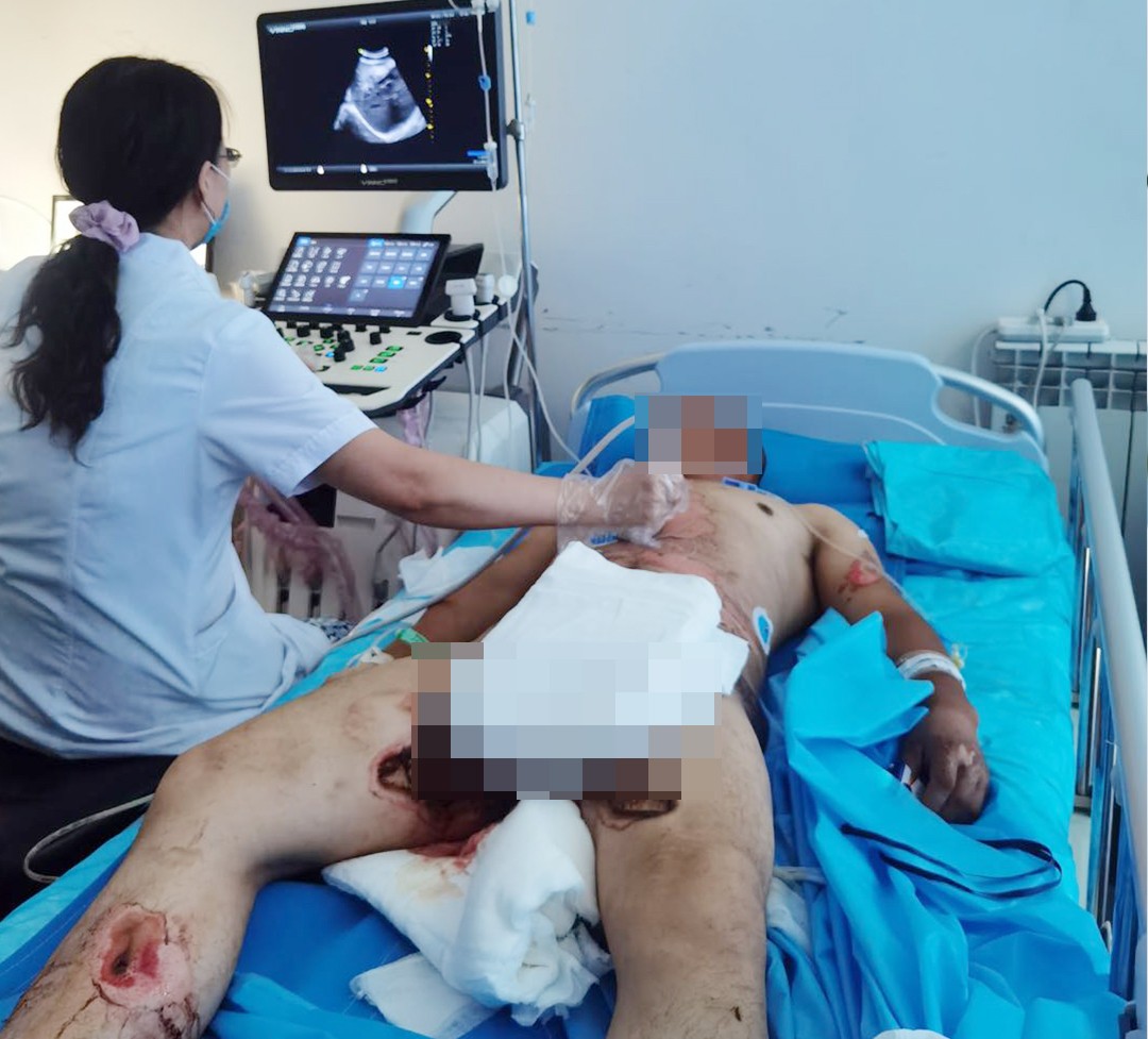 雷晋教授、吴学斌主任、霍履政副主任紧急制定救治方案,指导郝志新医生、王宏医生迅速展开有条不紊的救治工作:入住ICU,氧疗,密切监测患者生命体征;对右大腿及枕部渗血创面紧急压迫止血,同时迅速建立深静脉液体通路补液抗休克、纠正电解质紊乱;碱化尿液;抗感染;镇静止痛、制酸、祛痰、消肿、清除自由基、神经营养、应用糖皮质激素等治疗;并开通绿色通道,第一时间行心电图,心脏、腹部、下肢动静脉超声,头颅CT、颈部CT、胸部CT、腹部CT、脊柱正侧位等检查。并尽早联系心电图室陶文婷技师、B超室谭凤华主任、放射科常新彪主任获取检查结果。排除颅脑、脊柱、脊髓损伤,排除电击伤后大动脉血管损伤、排除空腔脏器出血、排除心脏损伤,排除肢体、脊柱骨折后等。于18:22急诊在麻醉科郭英俊主任、姚海英护士长(郭主任、姚护士长已下班,身心疲惫)等精兵强将的协同下行烧伤创面清扩创、深度烧伤神经血管探查、异种生物敷料覆盖术。